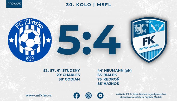 Ve 30. kole MSFL se Válcovny představily na hřišti Otrokovic, kde je čekal duel se Zlínskem. Domácí si v první půli vypracovali dvougólový náskok, který těsně před přestávkou korigoval Neumann. Po změně stran zaúřadoval Simon Studený, který během pouhých devíti minut zkompletoval hattrick a navýšil vedení Zlínska na 5:1. V závěru však Frýdeckomístečtí zabojovali – branky Bialka, Kedroně a Hajnoše znamenaly snížení na rozdíl jediné trefy. Vyrovnat se však Válcovnám už nepodařilo, a tak zápas skončil těsnou porážkou 4:5.