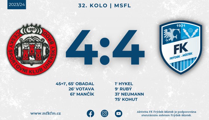 Frýdek-Místek si v gólově velice divokém zápase vypracoval již během úvodních devíti minut dvoubrankové vedení, aby nakonec čtvrthodiny před koncem srovnával na konečných 4:4. Branky Slezanů postupně stříleli Hykel, Rubý, Neumann a Kohut.