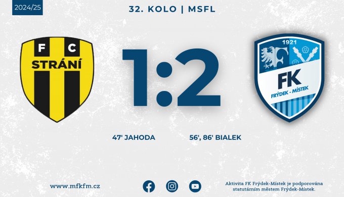 V závěrečném kole letošního ročníku MSFL zavítal Frýdek-Místek na hřiště Strání, které už mělo po výhře Rosic jistý sestup. První poločas žádné branky nepřinesl, ale hned po změně stran se prosadil střídající Jahoda a poslal domácí do vedení. V 56. minutě však vyrovnal Daniel Bialek a čtyři minuty před koncem dokonal obrat – Frýdek-Místek tak zvítězil 2:1. Tímto si připsal patnáctou výhru v sezóně a obsadil konečné páté místo v tabulce.