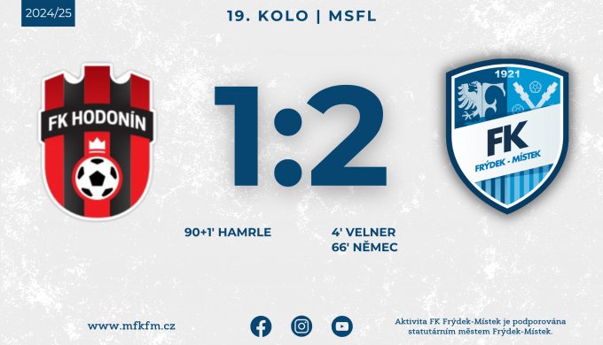 Frýdeckomístečtí slaví druhou výhru v anglickém týdnu! Po vítězství nad rezervou Slovácka si Válcovny odvážejí další tři body, tentokrát z Hodonína. Skóre otevřel už ve 4. minutě kapitán Michal Velner, a v 66. minutě přidal svůj premiérový gól Denis Němec. Domácí v nastavení už jen zmírnili porážku na konečných 1:2.